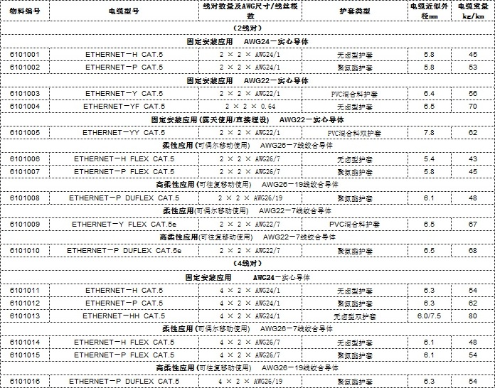 ETHERNET CAT.5/CAT.5E/FLEX CAT.5/FLEX CAT.5E技術(shù)參數(shù)