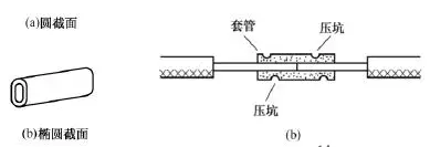 (1)銅導(dǎo)線或鋁導(dǎo)線的緊壓連接。壓接套管截面有圓形和橢圓形兩種,如圖12所示。圓截面套管內(nèi)可以穿入一根導(dǎo)線,橢圓截面套管內(nèi)可以并排穿入兩根導(dǎo)線。