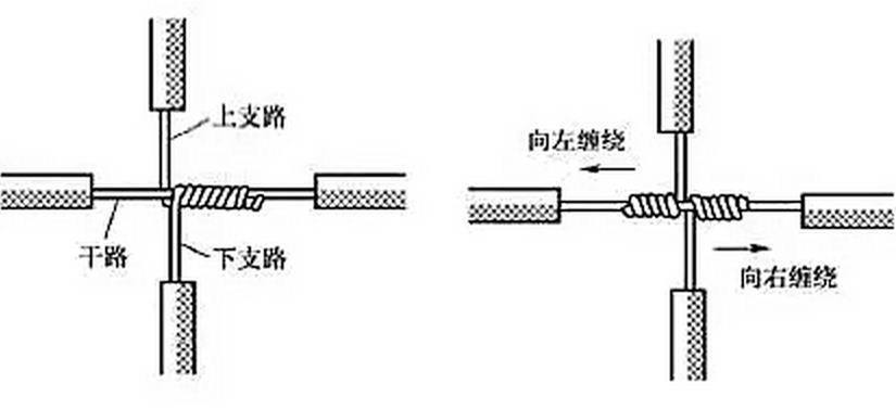 導(dǎo)線分支接頭的絕緣處理基本方法同上,T字分支接頭的包纏方向如圖21所示,走一個T字形的來回,使每根導(dǎo)線上都包纏兩層絕緣膠帶,每根導(dǎo)線都應(yīng)包纏到完好絕緣層的兩倍膠帶寬度處。