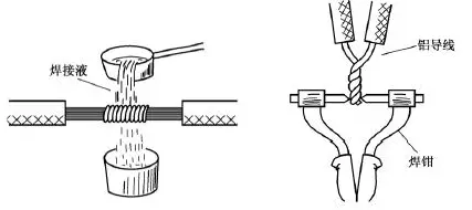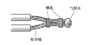氣焊是指利用氣焊槍的高溫火焰,將鋁芯線的連接點加熱,使待連接的鋁芯線相互熔融連接。氣焊前應(yīng)將待連接的鋁芯線絞合,或用鋁絲或鐵絲綁扎固定,如圖19所示。