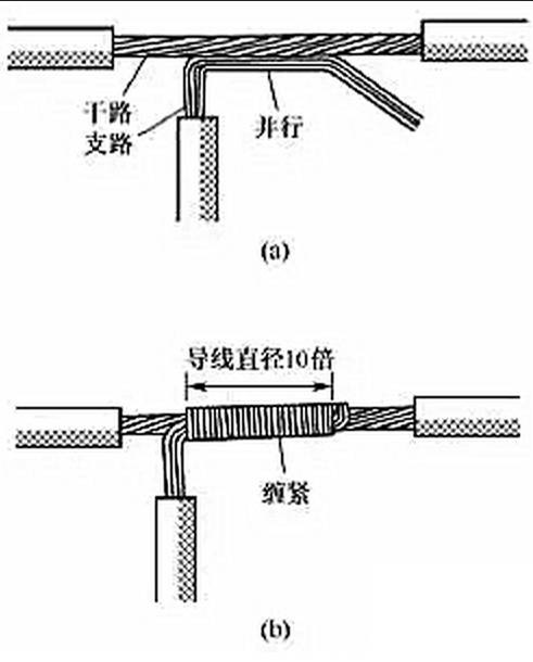 (6)同一方向的導(dǎo)線的連接。當(dāng)需要連接的導(dǎo)線來自同一方向時,可以采用圖10所示的方法。對于單股導(dǎo)線,可將一根導(dǎo)線的芯線緊密纏繞在其他導(dǎo)線的芯線上,再將其他芯線的線頭折回壓緊即可。對于多股導(dǎo)線,可將兩根導(dǎo)線的芯線互相交叉,然后絞合擰緊即可。對于單股導(dǎo)線與多股導(dǎo)線的連接,可將多股導(dǎo)線的芯線緊密纏繞在單股導(dǎo)線的芯線上,再將單股芯線的線頭折回壓緊即可。